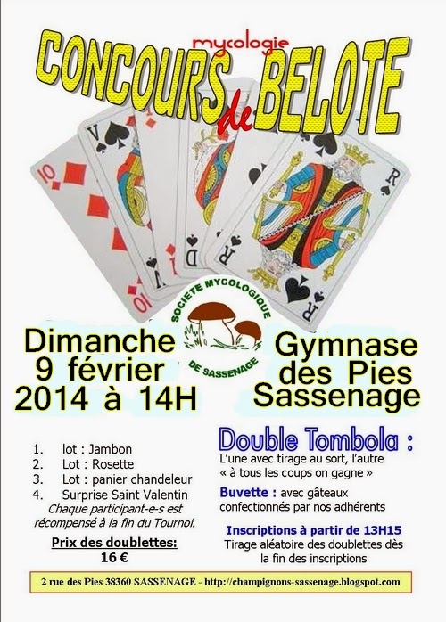 | Date : Dimanche 09/02/2014 Horaire 14:00 hTarif : 16 | ![]() | Lieu : Sassenage (38) Gymnase des Pies ![]() 2 rue des Pies, , 38360, Sassenage http://champignons-sassenage.blogspot.fr/ ![]() | |||||